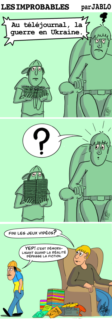 No more video games 23 March 2022Comics, The Improbablesjablouin Partager : Click to share on Facebook (Opens in new window) Facebook Click to share on Pinterest (Opens in new window) Pinterest Click to email a link to a friend (Opens in new window) Email More Click to share on LinkedIn (Opens in new window) LinkedIn Click to share on Reddit (Opens in new window) Reddit Click to share on Tumblr (Opens in new window) Tumblr Like this:Like Loading...